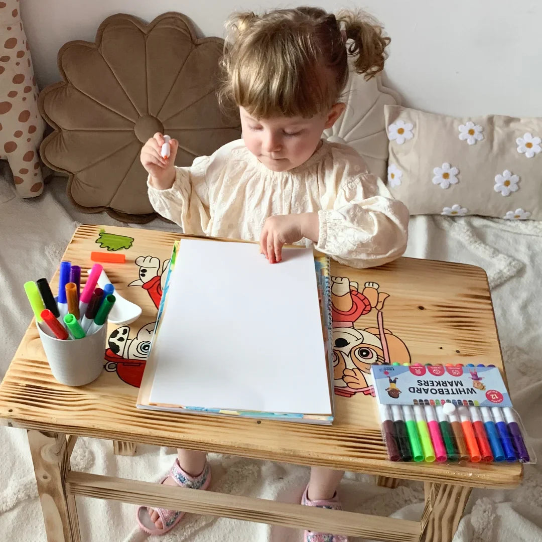 Ton enfant dessine, colorie ou écrit sur n’importe quelle surface adaptée : tissu, papier ou support effaçable. Les couleurs sont vives, faciles à utiliser et sûres pour les enfants. 🌈
